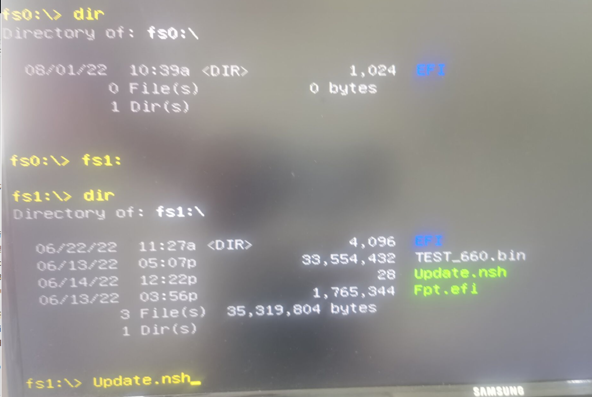 3.进入U盘目录, 键入fs0: 或fs1: …类推,dir查看分区目录,如果有Update.nsh和bin文件,则在提示符下输入Update.nsh后按回车即可。