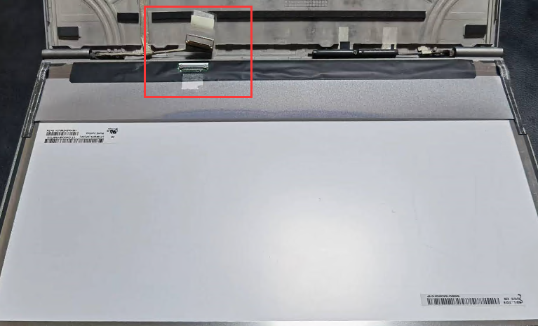 2、笔记本屏幕没有用螺丝固定的,和屏幕壳使用双面胶和黑胶条粘合的,所以屏幕和外壳连接稍微用翘片撬出一处就可以拿出,屏幕后面还有一处排线,如下图,撕开粘合处,卡扣往上拉,然后拔掉排线即可拿掉整个屏幕。
