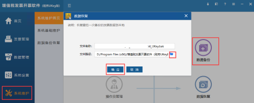 2.系统维护→数据恢复→选择文件路径→确定,恢复成功后,进行重新登录即可看到之前备份恢复的完整数据。(新版的会提示要求恢复最近一次的备份文件进行恢复,比如备份数据123456Key.bak)