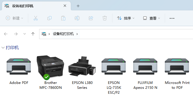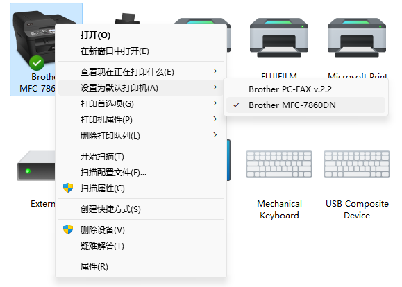在Windows 11系统下安装兄弟打印机Brother MFC-7860DN驱动,但是默认打印机为Brother PC-FAX v2.2传真,不是打印机Brother MFC-7860DN,解决方法如下: