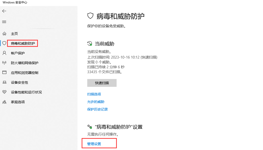 从搜索结果中Windows 安全中心应用,转到”病毒&威胁防护”,在”病毒&威胁防护设置”下选择”管理设置”。