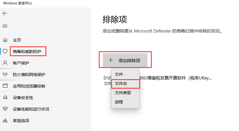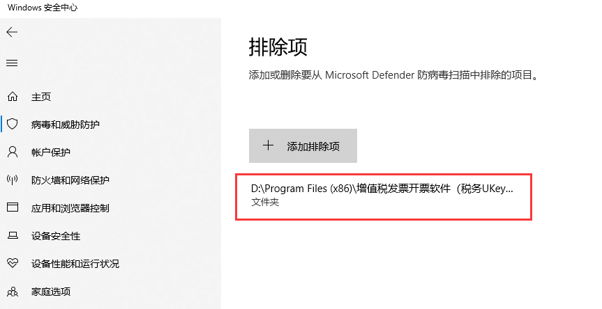 如下图,添加的排除项的文件夹路径为:D:\Program Files (x86)\增值税发票开票软件(税务UKey版)