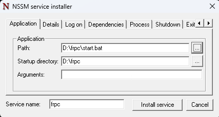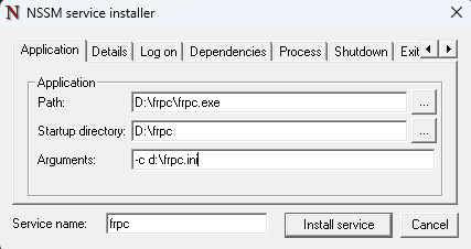 Application Path:D:\frpc\frpc.exe Startup directory:D:\frpc Arguments:-c d:\frpc.ini