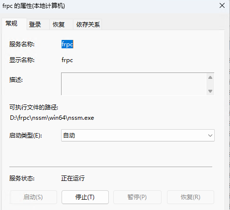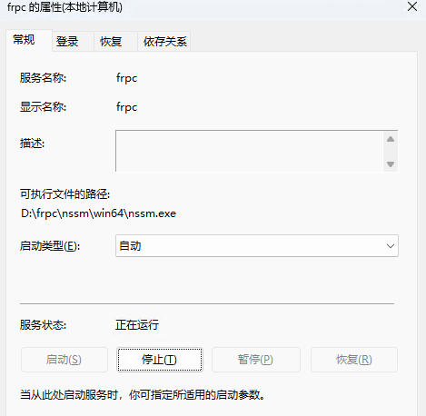 PS C:\Users\WIN11> D:\frpc\nssm\win64\nssm.exe install frpc Service "frpc" installed successfully! PS C:\Users\WIN11> D:\frpc\nssm\win64\nssm.exe start frpc frpc: START: 操作成功完成。
