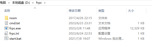 3.新建frpc文件夹,将frpc.exe和frpc.ini放在根目录,将解压出来的nssm文件夹放在frpc的根目录,目录如下图: