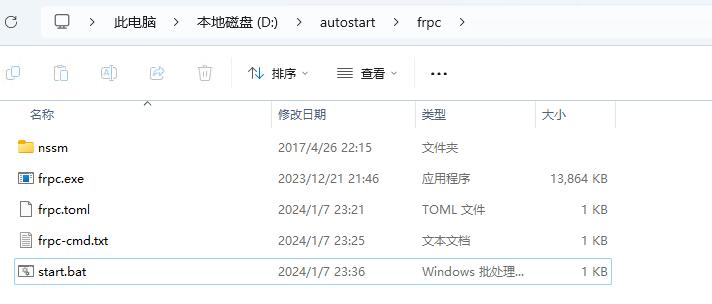 3.新建frpc文件夹,将frpc.exe和frpc.toml放在autostart/frpc目录下,将解压出来的nssm文件夹放在autostart/frpc的目录下,目录如下图: