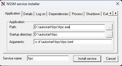 d:\autostart\frpc\nssm\win64\nssm.exe install frpc d:\autostart\frpc\frpc -c d:\autostart\frpc\frpc.ini