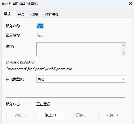 PS C:\Users\pc> D:\autostart\frpc\nssm\win64\nssm.exe install frpc Service "frpc" installed successfully! PS C:\Users\pc> D:\autostart\frpc\nssm\win64\nssm.exe start frpc frpc: Unexpected status SERVICE_START_PENDING in response to START control.