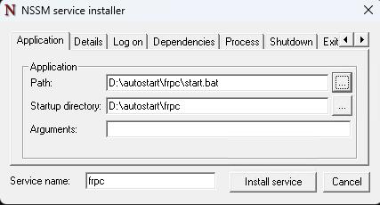 Application Path:D:\autostart\frpc\frpc.exe Startup directory:D:\autostart\frpc Arguments:-c d:\autostart\frpc\frpc.toml
