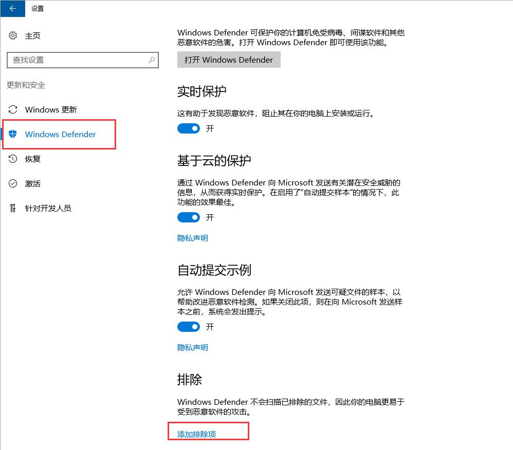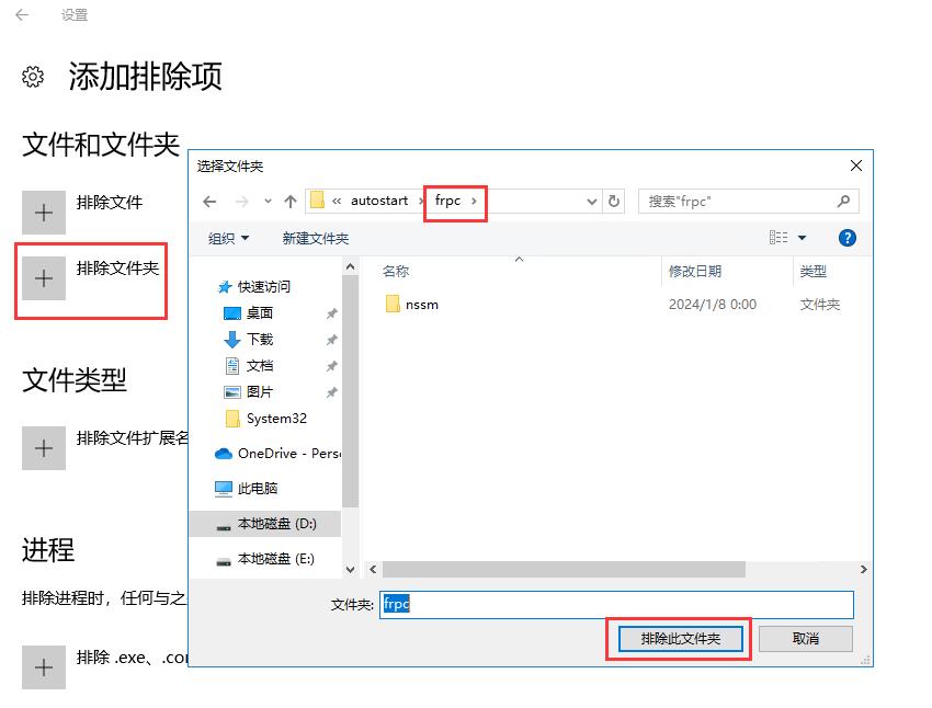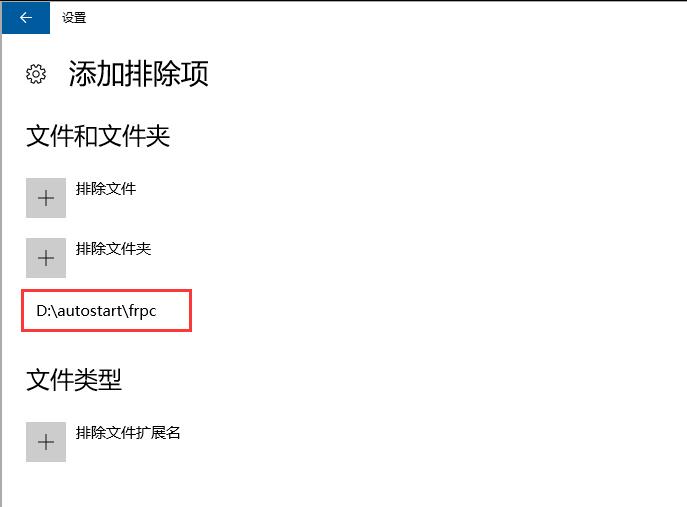 Windows Defender界面→选择右上角 设置→Windows Defender→排除→添加排除项→排除文件夹→添加排除项的【文件夹】→找到frpc的存放路径例如:D:\autostart\frpc文件夹→选择排除此文件夹→即可完成,电脑重启后frpc不再被误杀。