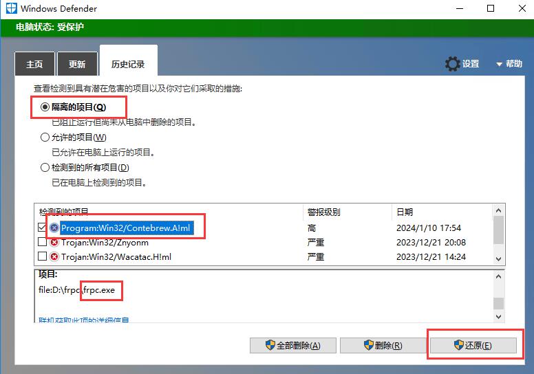 在Windows 2016服务器系统配置frpc自启动被误杀,按照一般的操作:从Windows Defender→保护历史记录→隔离的项目→操作:还原,但是重启后一样被误杀,可以通过添加排除项去解决该问题,具体方法如下: