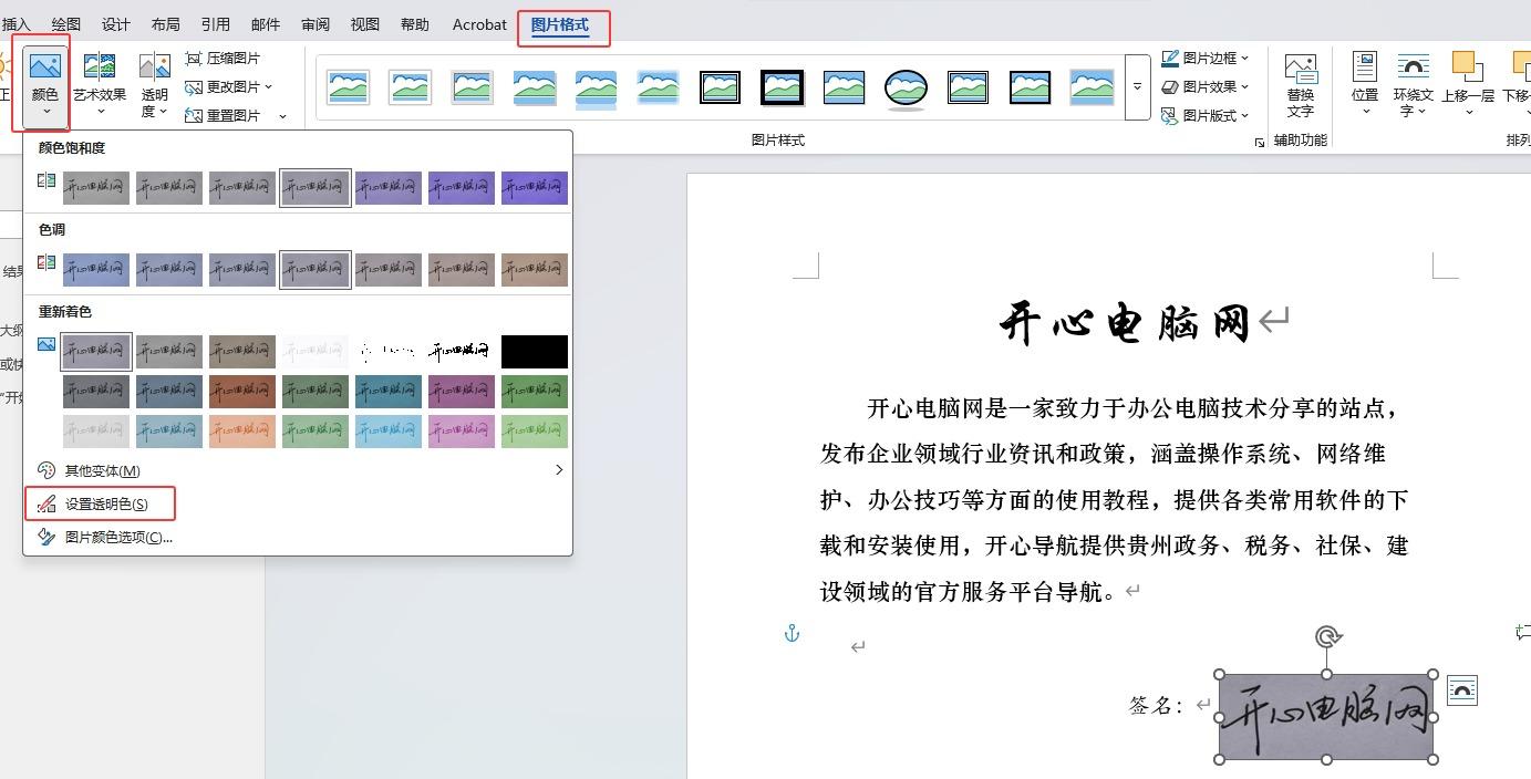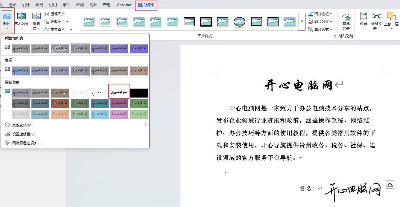 3、裁剪合适后,【图片格式】→【颜色】→【设置透明色】后变成吸管图标→选中图片,完成将背景色变成透明色,但是背景还是没有完全透明,继续选中图片→【颜色】→【重新着色】→选择第一排从右数第二个效果图片,文档内手写签名已经很完美的转为电子签名。最终完成效果图如下: