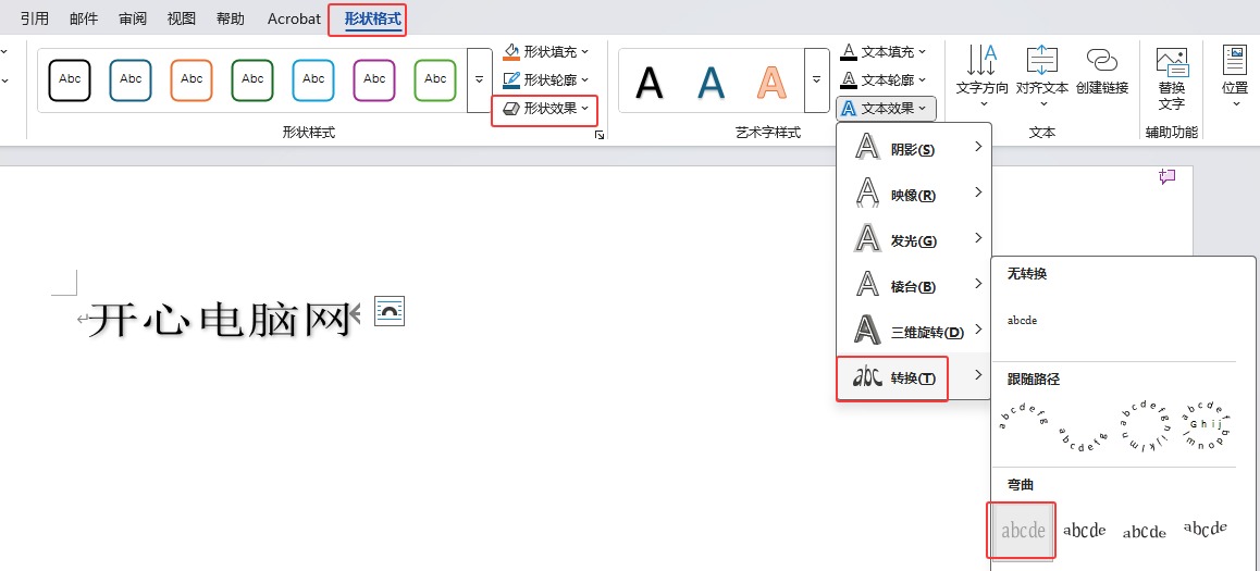 2、选中【边框】→【形状格式】→【形状效果】→【转换】→【弯曲 选择 第一个 正方形】→【随意拉伸即可】