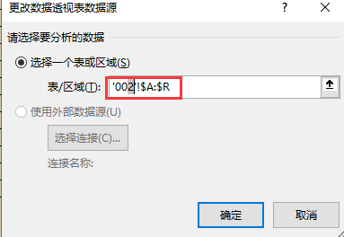 二、新建数据透视表表名为ts001(2),分析-更改数据源-选择一个表或区域,由于我是选定的002的表名,所有的数据表都是统一的列内容,告诉大家个技巧直接把’001′!$A:$R手动输入更改’002′!$A:$R,确定后,马上生成数据透视内容,不用再进去重新选择行列了。如下图: