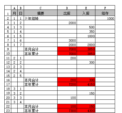 Excel 求和本月合计和本年累计,如果是月和日为单独列用SUMIF函数解决,具体行列标题如下图不再一一说明,D列出库计算本月合计和本年累计函数如下: