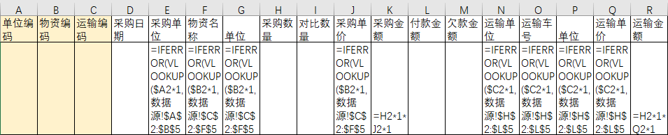 | 单位编码 | 物资编码 | 运输编码 | 采购日期 | 采购单位 | 物资名称 | 单位 | 采购数量 | 对比数量 | 采购单价 | 采购金额 | 付款金额 | 欠款金额 | 运输单位 | 运输车号 | 单位 | 运输单价 | 运输金额 |