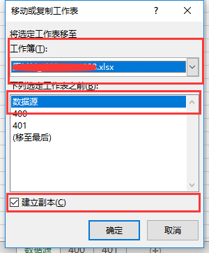 注:如果是跨表格进行移动复制数据源模板的话,本表打开,然后把需要移动复制到的另外一个表打开,本表右键移动复制-选中红色框标注的,然后第一个红色框内下拉框选择移至的新表,如下图