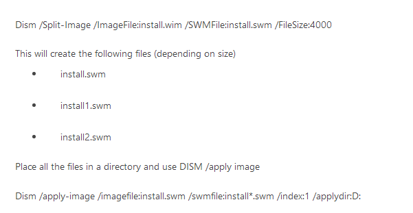 Dism /Split-Image /ImageFile:install.wim /SWMFile:install.swm /FileSize:4000