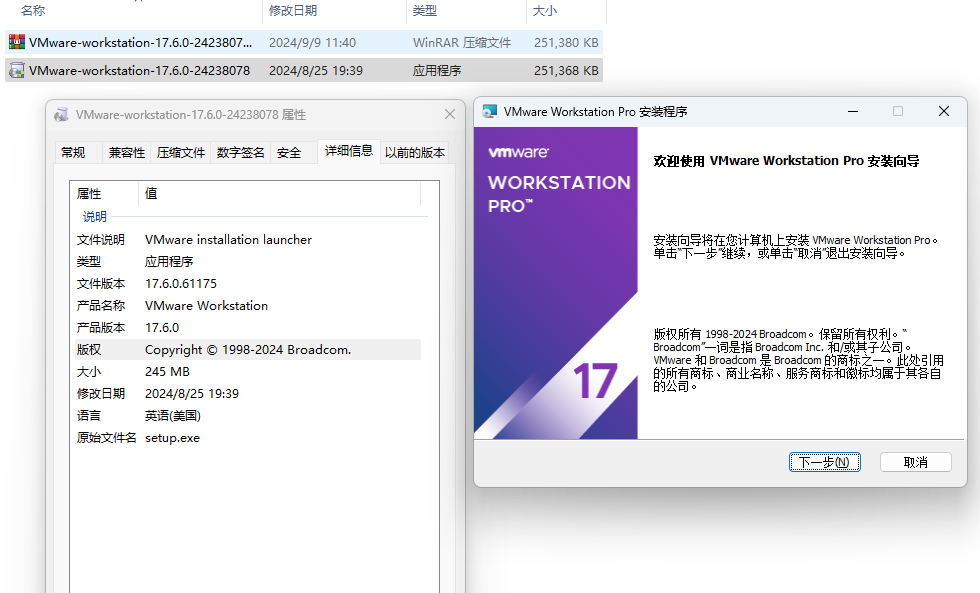 版本号: VMware Workstation Pro 17.6.0 | 2024年09月03日 | Build 24238078 官网地址: https://docs.vmware.com/en/VMware-Workstation-Pro/17.6/rn/vmware-workstation-176-pro-release-notes/index.html 下载地址: https://softwareupdate.vmware.com/cds/vmw-desktop/ws/17.6.0/24238078/windows/core/VMware-workstation-17.6.0-24238078.exe.tar