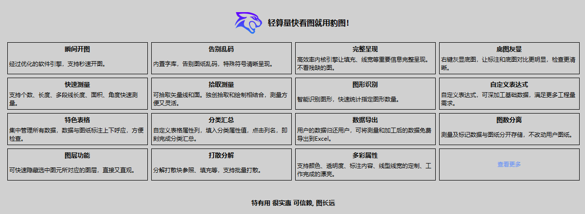 具有CAD算量CAD软件CAD插件常用功能,既是迷你CAD看图工具,又是强大的CAD助手。