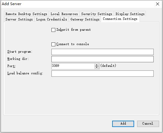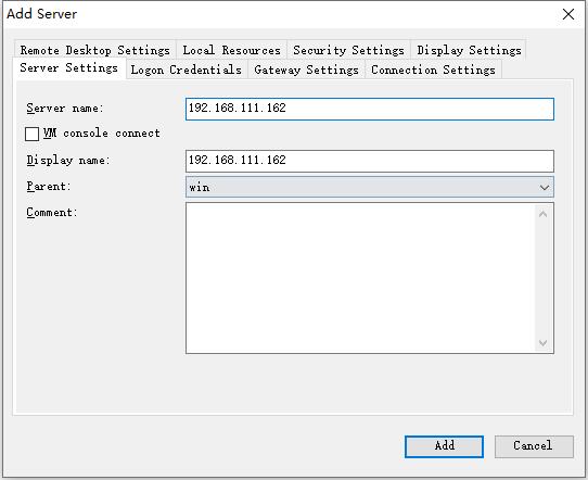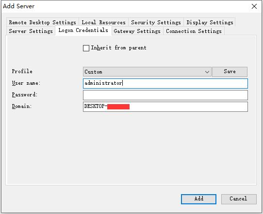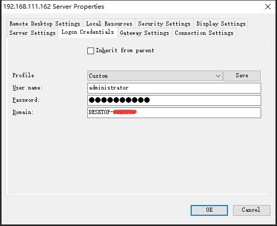 server settings 输入服务器地址,connection settings 设置服务器远程桌面端口,logon credentials 选项 inherit from parent 继承默认权限√去掉,输入账户不要输入密码ok保存,右键左侧栏的服务器管理地址的reconnect server重新打开提示需输入密码。