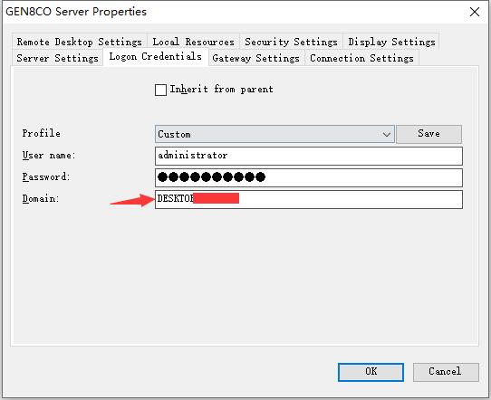 logon credentials 选项 inherit from parent 继承默认权限√去掉,Domain更换本地电脑的用户名,如windows 10 选择此电脑 右键属性 查看计算机名复制到Domain即可。
