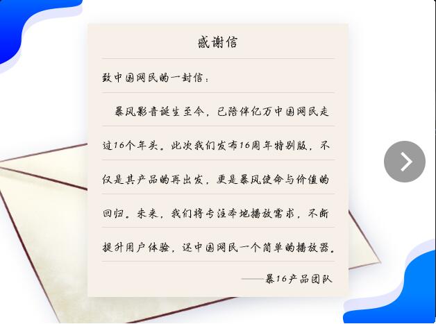 暴风影音诞生至今,已陪伴亿万中国网民走过16个年头。此次我们发布16周年特别版,不仅是其产品的再出发,更是暴风使命与价值的回归。未来,我们将专注本地播放需求,不断提升用户体验,还中国网民一个简单的播放器。
