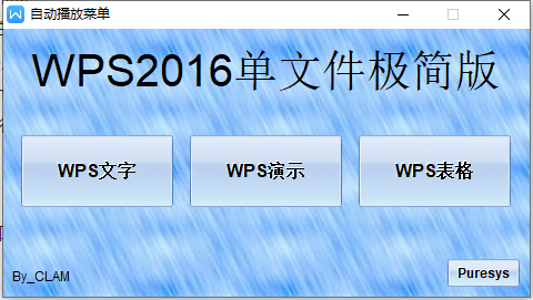 Puresys原文地址:https://www.puresys.net/1039.html 版本:WPS2016单文件极简版_2020.11.1_CLAM 蓝奏云下载地址:https://clamowo.lanzoux.com/ic2puhxvpgh