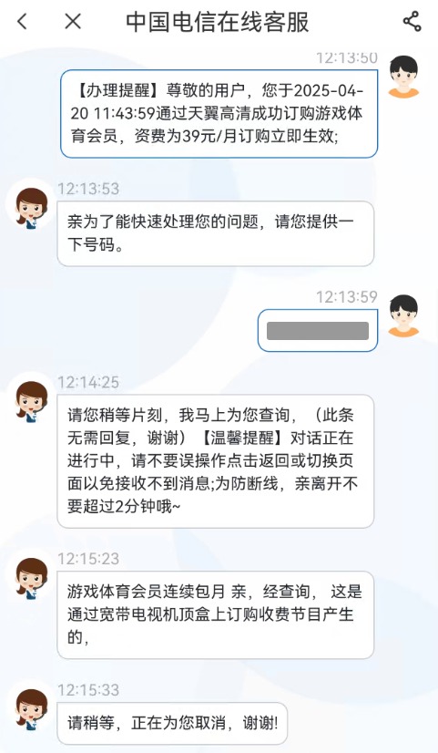 1.客户提供订购信息例如:【办理提醒】尊敬的用户,您于2025-04-20 11:43:59通过天翼高清成功订购游戏体育会员,资费为39元/月订购立即生效; 2.客户在提供手机号码; 3.客服查询确定: 游戏体育会员连续包月 亲,经查询, 这是通过宽带电视机顶盒上订购收费节目产生的。 4.客服取消业务: 业务已为您取消成功,下月起不再订购将不再收取费用,同时建议您在天翼高清电视上设置加锁服务,可防止误定。设置方法已经通过短信发送给您,请注意查收。