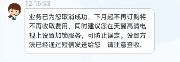 电视机顶盒天翼高清ITV因不小心订购了收费节目,收到订购成功通知: