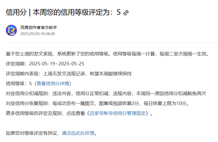 基于您上周的发文表现,系统更新了您的信用等级。信用等级每周一计算,每周二至次周周一生效。