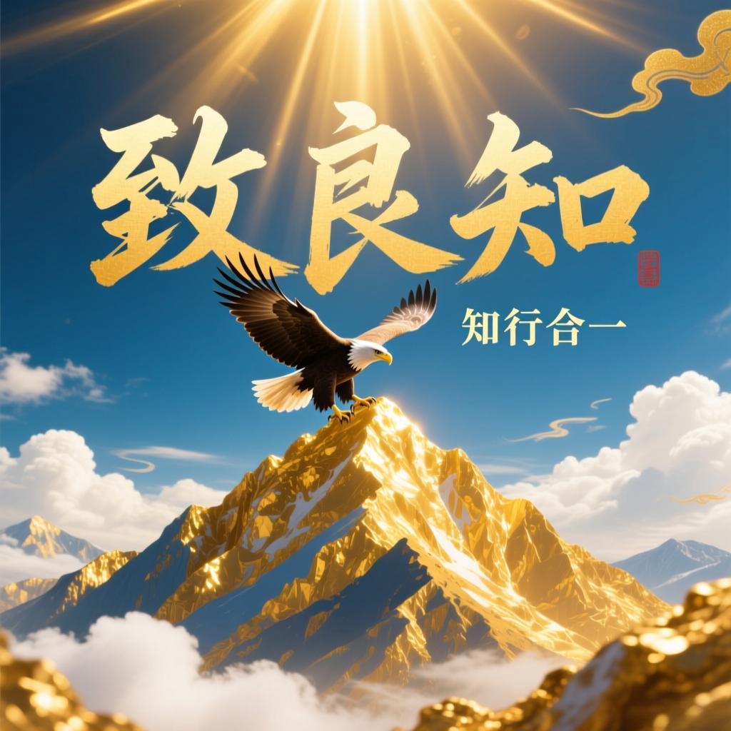 画面以“致良知”为核心主题,搭配“知行合一”标语,通过视觉符号(雄鹰、山峰、阳光、云雾)与文字意象的融合,生动诠释王阳明心学中“致良知”与“知行合一”的核心内涵,同时传递出积极向上的精神力量。