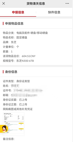 该阶段处理,微信关注公众号“DHL快递 ”,查快递选择在线申报,选择快单号,进行申报,这是我买的硬盘的申报信息,网购截图记得截取亚马逊的订单图就可以了,如下图: