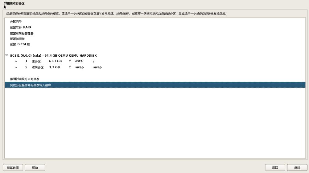 请选择一个分区以修改其设置:完成分区操作并修改写入磁盘【默认】