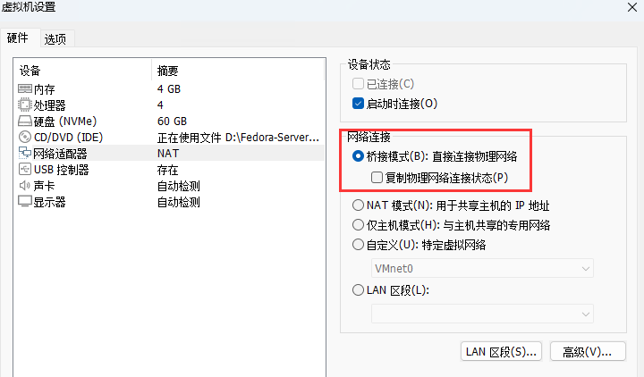 网络适配器:【网络连接】选择【桥接模式(B):直接连接物理网络】