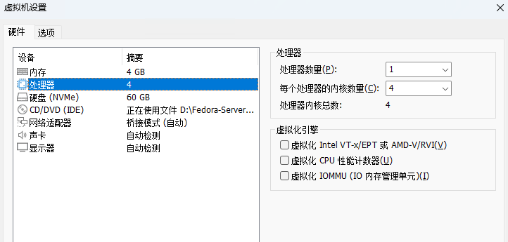 处理器:【处理器数量】例如:1,要是2个处理器,就写2,【每个处理器的内存数量】例如:4,【虚拟化引擎】默认不要勾选