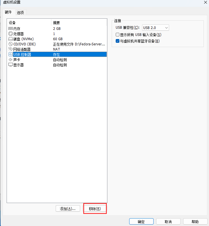 USB控制器:选择【移除】,一般用不到,移除即可