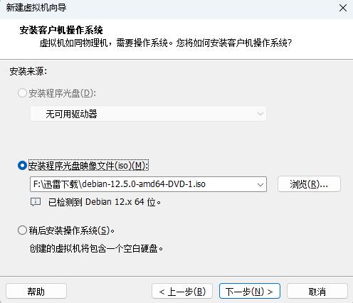 安装客户机操作系统:【安装来源】【安装程序光盘映像文件(iso)】选择debian-12.5.0-amd64-DVD-1.iso进行下一步