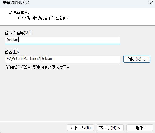 命名虚拟机:【虚拟机名称】例如:Debian,【位置】【浏览】选择自定的目录E:\Virtual Machines\Fedora进行下一步