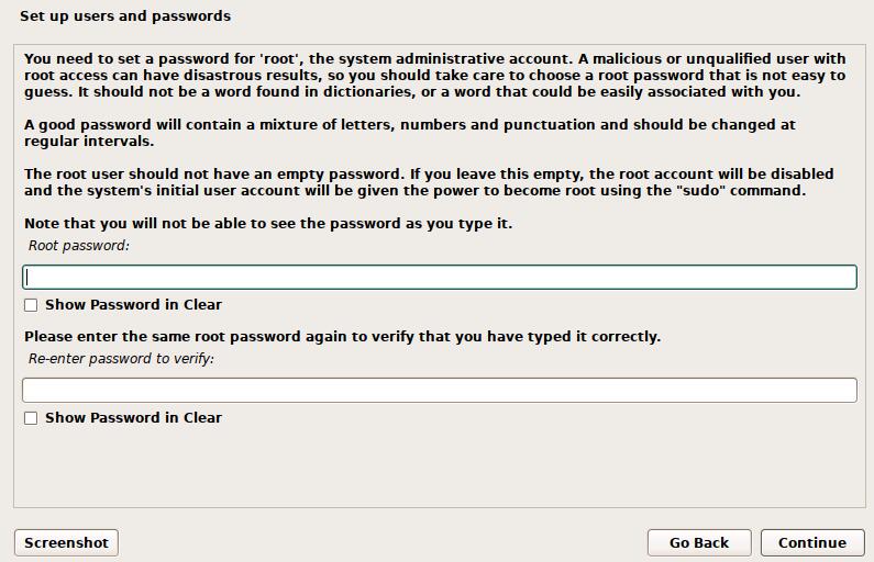 set up users and passwords设置root密码:建议root密码为空(建议留空,便于执行sudo,如有需求自行设置)