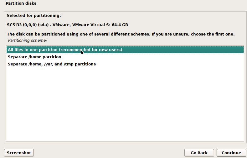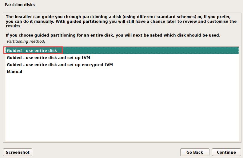 partition disks分区方法:选择guided-use entire disk