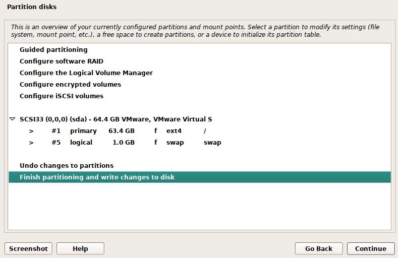 完成分区操作并修改写入磁盘:finish partition and write changes to disk