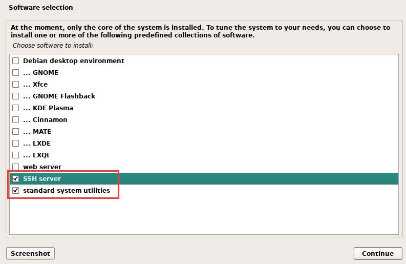 不选择桌面环境,choose software to install :再增加√勾选 SSH server,去掉勾选1和2选项,倒数1和2选项选择勾选