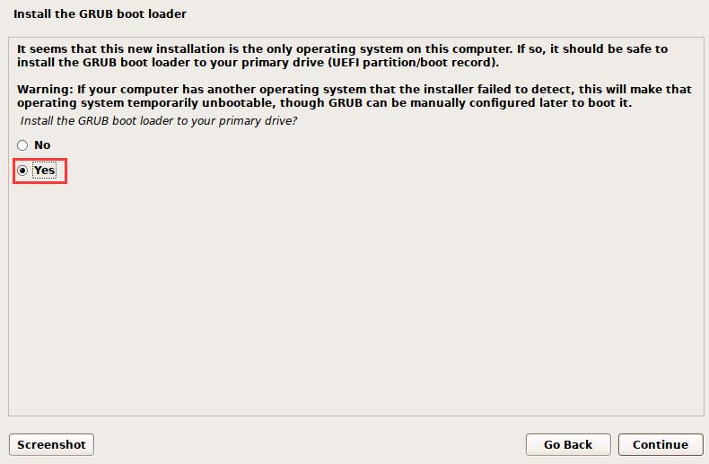 install the grub boot loader将grub启动引导器安装至您的主驱动器 :选择 yes