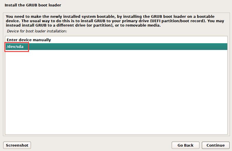 device for boot loader installation安装启动引导的设备: 选择 /dev/sda 一般在第二项(不要选择手动输入设备)