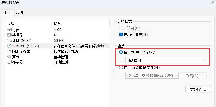 10.虚拟机设置:cd/dvd(sata):更改为使用物理驱动器