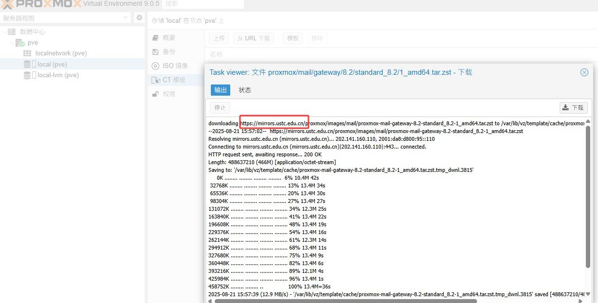 在local(pve)→CT模板→【模板】随便找一个→【下载】,如果输出我们更改的https://mirrors.ustc.edu.cn/proxmox地址,并能进行下载说明更改成功。