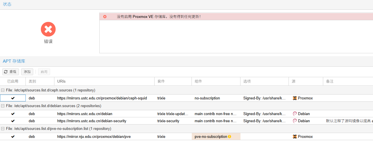 国内参考:https://mirrors.ustc.edu.cn/help/proxmox.html