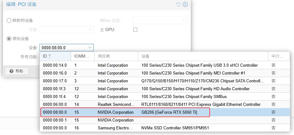 右下角勾选√ 高级:硬件→添加pci设备→原始设备→找到显卡比如5060ti