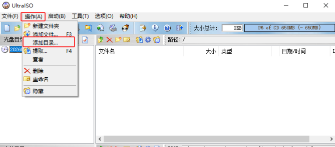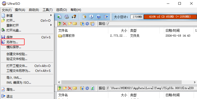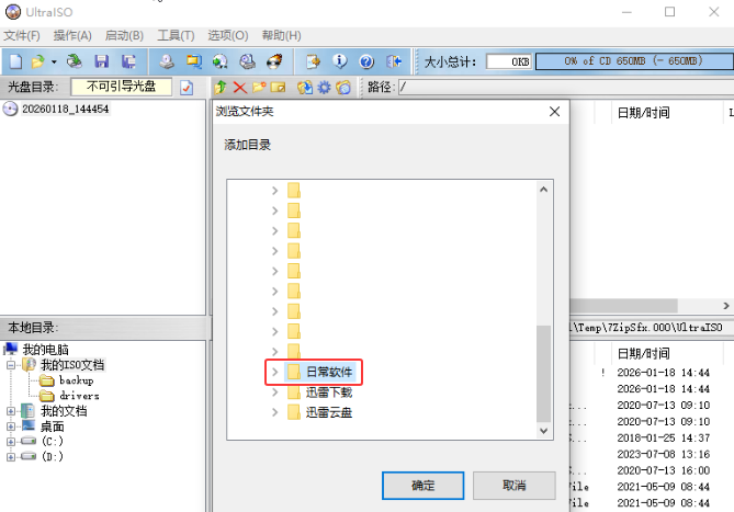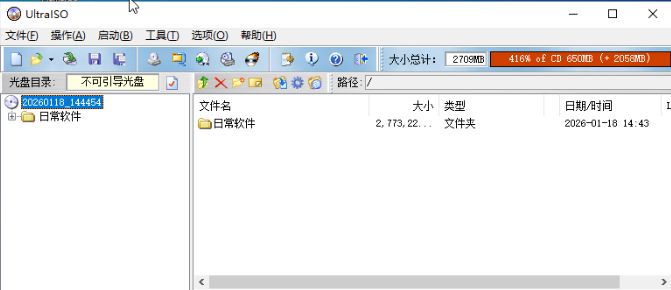 打开Ultraiso→操作→添加目录→例如:日常软件→确定→文件夹添加进去了如下图→文件→另存为→例如soft20260118→开始处理→完成后soft20260118.iso标准文件生成。